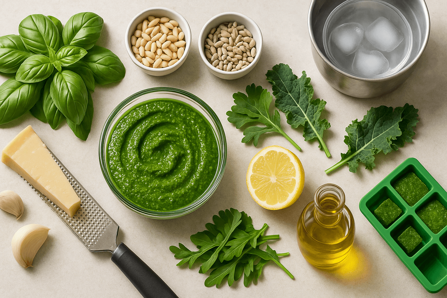 Homemade Pesto That Stays Bright Green (Not Bitter): Blanch‑Shock Timing, Oil Choices, and a Freezer‑Proof Ratio for Basil, Kale, and Arugula